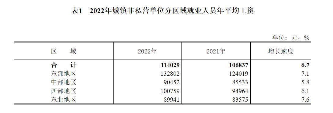 2022年城镇非私营单位分区域就业人员年平均工资。来源:国家统计局
