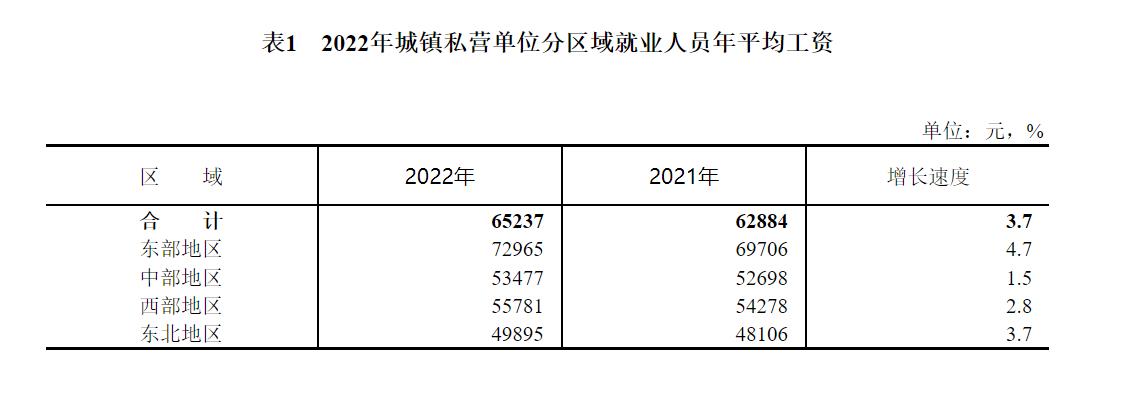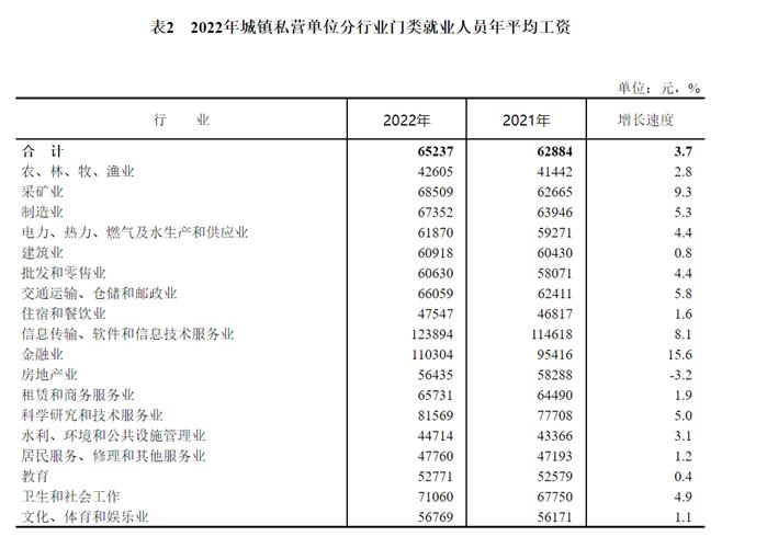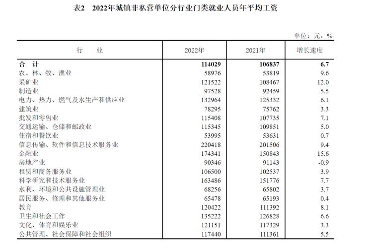数据显示,2022年,全国城镇非私营单位就业人员年平均工资为114029元,比上年增长6.7%,增速比2021年回落3.0个百分点,扣除价格因素实际增长4.6%;城镇私营单位就业人员年平均工资为65237元,比上年增长3.7%,回落5.2个百分点,扣除价格因素实际增长1.7%。