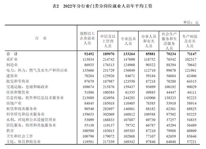 2022年分行业门类分岗位就业人员年平均工资。来源:国家统计局