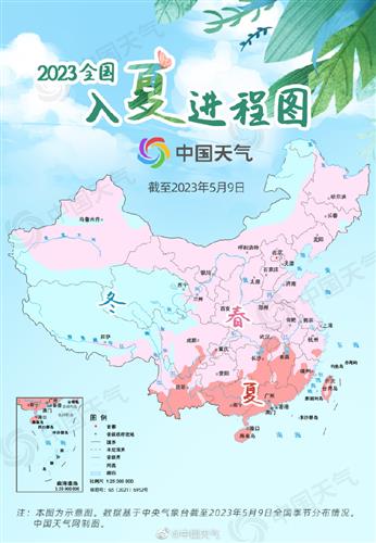 总体来看,今年入夏进程相比常年略偏早。据中国天气网气象分析师石妍介绍,截至5月9日,我国华南大部、云南大部、湖南东部、江西大部、湖北东南部以及重庆部分地区已进入气象学意义上的夏季。除了新疆局地、内蒙古东部、青海和西藏高海拔地区还处于冬季,其他地区都处于春季。