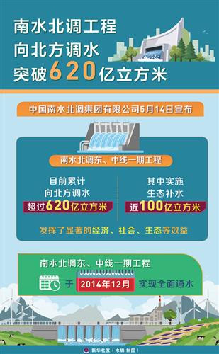 新华社北京5月14日电 中国南水北调集团有限公司14日宣布,南水北调东、中线一期工程目前累计向北方调水超过620亿立方米,其中实施生态补水近100亿立方米,发挥了显著的经济、社会、生态等效益。