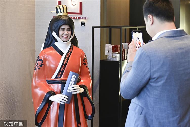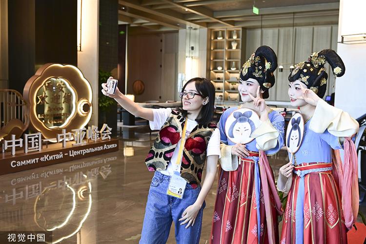 2023年5月18日,西安,参加报道中国—中亚峰会的乌兹别克斯坦记者在一处西安文旅元素打卡点拍照。
