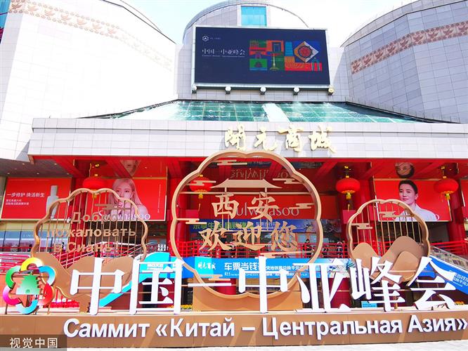 西安雁塔区一处商场外LED电子屏上展示的中国—中亚峰会宣传海报。