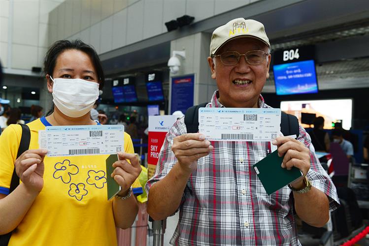 2023年5月22日,台胞周基树和太太将搭乘福州-台北松山客运航线返回台北。台胞周基树4月初从台北到汉中探亲,乘直航航班到成都后再转高铁。近几日,他和太太到福州陪孩子参加考试。“很凑巧,我们准备今天回台湾,刚好有了福州直飞台北的航班。”周基树说,他和太太想让小孩读福州的大学,以后在福州就业,因为离台北很近,彼此往来方便。视觉中国 图