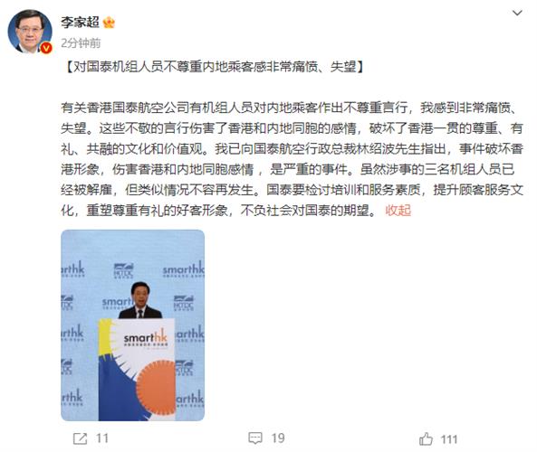 @李家超 5月24日发文:有关香港国泰航空公司有机组人员对内地乘客作出不尊重言行,我感到非常痛愤、失望。这些不敬的言行伤害了香港和内地同胞的感情,破坏了香港一贯的尊重、有礼、共融的文化和价值观。我已向国泰航空行政总裁林绍波先生指出,事件破坏香港形象,伤害香港和内地同胞感情 ,是严重的事件。虽然涉事的三名机组人员已经被解雇,但类似情况不容再发生。国泰要检讨培训和服务素质,提升顾客服务文化,重塑尊重有礼的好客形象,不负社会对国泰的期望。
