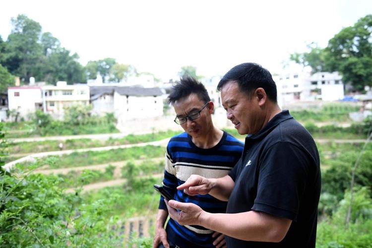 龙里县醒狮镇大岩村党支部副书记韦吉良(右一)指导村民使用“黔村规”App。新华社发(王立信摄)