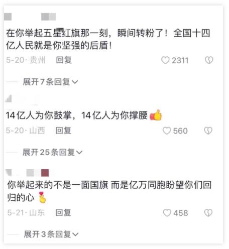 有网友留言:“在你举起五星红旗那一刻,瞬间转粉了!全国十四亿人民就是你坚强的后盾!”“你举起来的不是一面国旗,而是亿万同胞盼望你们回归的心”“14亿人为你鼓掌,14亿人为你撑腰”。