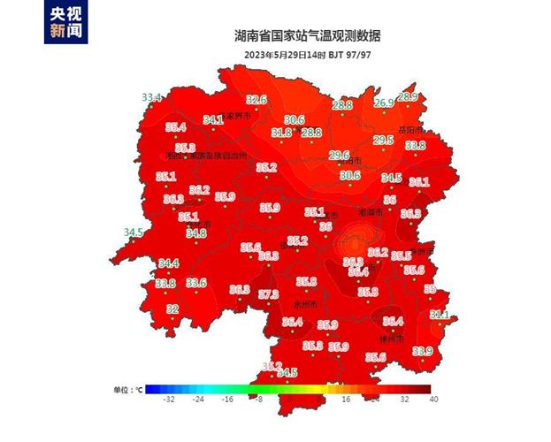 据湖南省国家站气温观测数据显示,5月29日14时,湘中湘南大部气温在34~36℃之间,全省共52县市区出现35℃以上高温,16县市区出现36℃或36℃以上高温,其中永州东安14时气温达37.6℃,为同时段全省最高。湘北云系较多,气温偏低,气温在29~31℃。