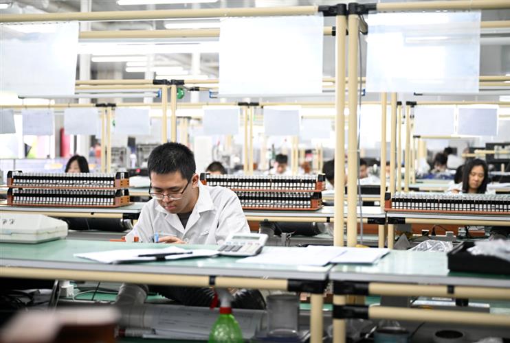工作人员在天津宜科自动化股份有限公司传感器生产车间内工作。新华社记者 赵子硕 摄