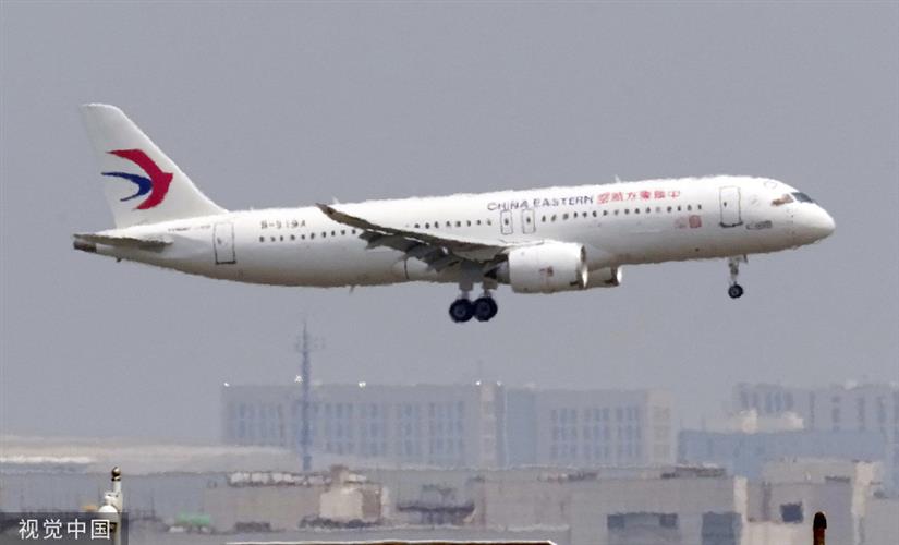 2023年5月28日,北京,东方航空的C919飞机抵达机场。 视觉中国 图