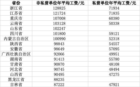 从数值看,浙江、江苏、重庆、云南、山东、四川、内蒙古7个省份城镇非私营单位就业人员年平均工资超过10万元,浙江、江苏在12万元以上,浙江目前最高,为128825元。