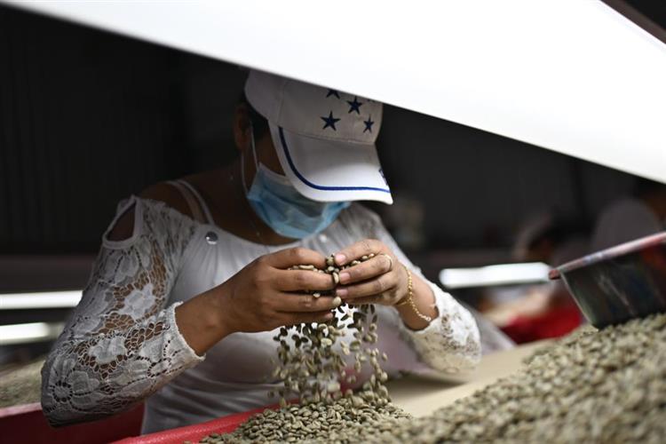 5月6日,在洪都拉斯马尔卡拉的一家咖啡工厂,工人手工挑选不同等级的咖啡生豆。