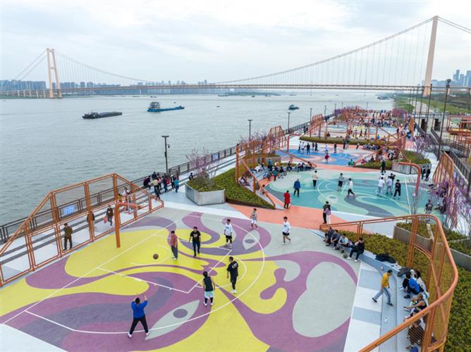 2023年3月26日,湖北省武汉市汉阳区杨泗港都市T台“国风”篮球场。曾经废弃的货运码头变身新潮时尚篮球场和临江公园。新华社记者熊琦 摄