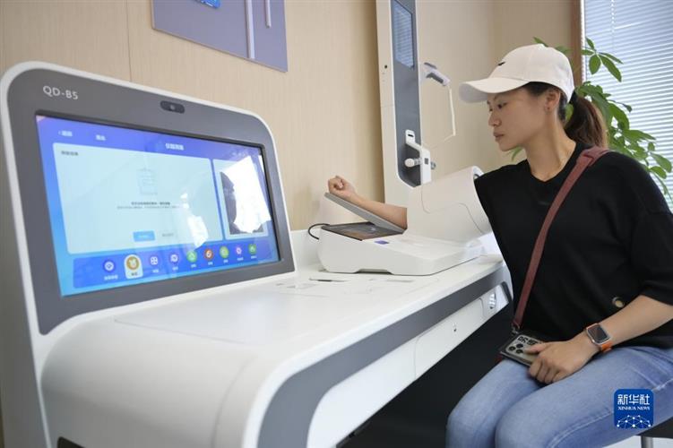 6月7日,在浙江省杭州市萧山区梅林村美好生活中心,一名女士自助测量血压。新华社记者 才扬 摄