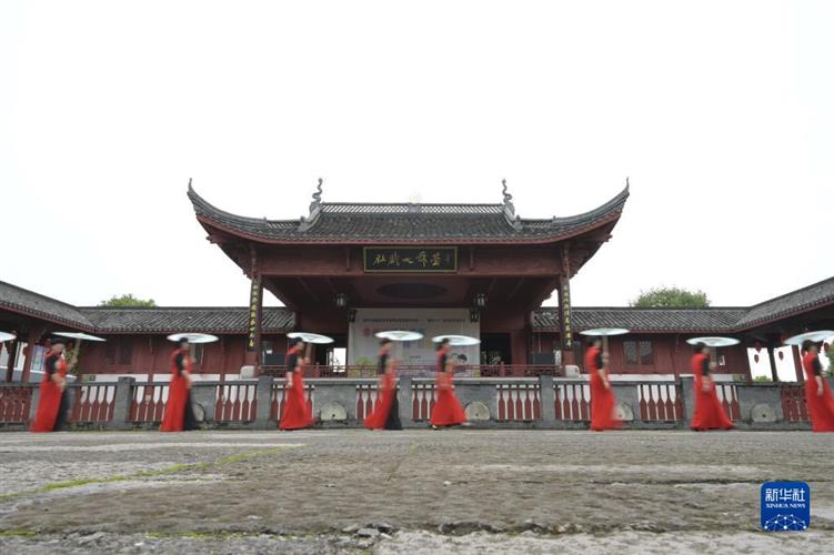 6月7日,在浙江省绍兴市孙端街道安桥头村的社戏大舞台,村民表演旗袍走秀。新华社记者 才扬 摄