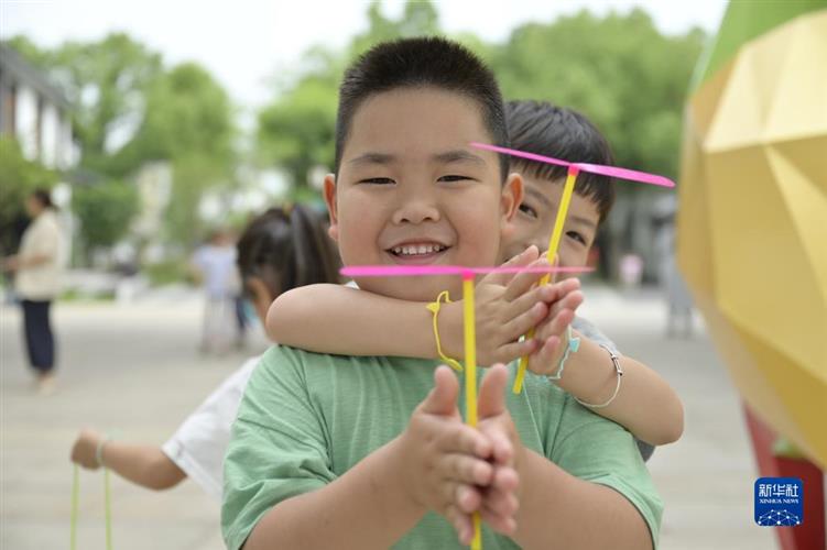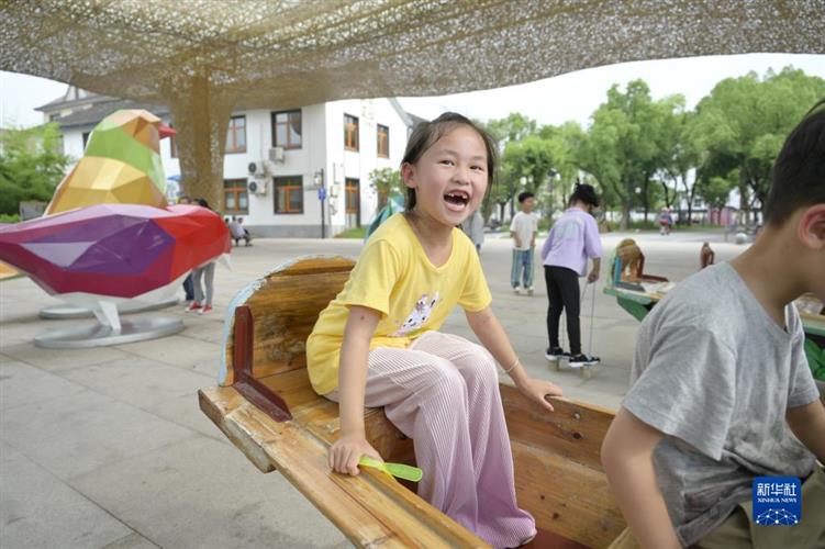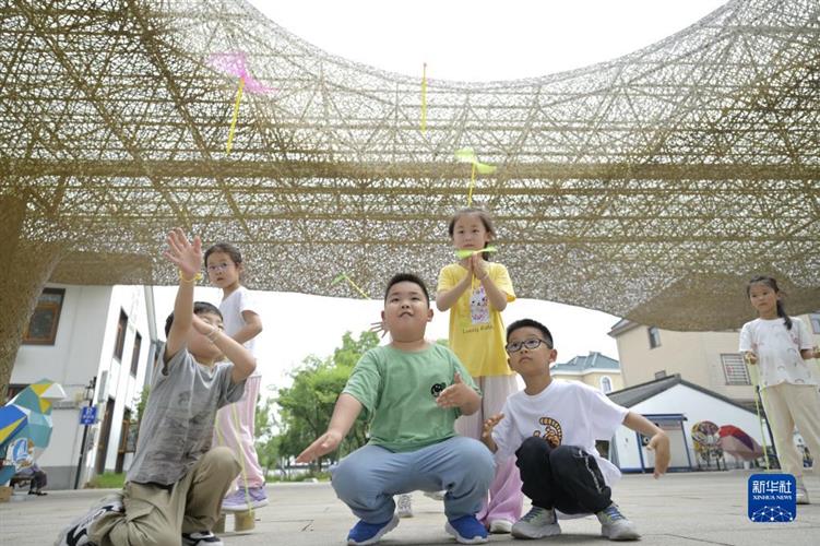 6月7日,在浙江省绍兴市孙端街道安桥头村,孩子们在“弶与小鸟雀”竹弶广场上玩耍。新华社记者 才扬 摄