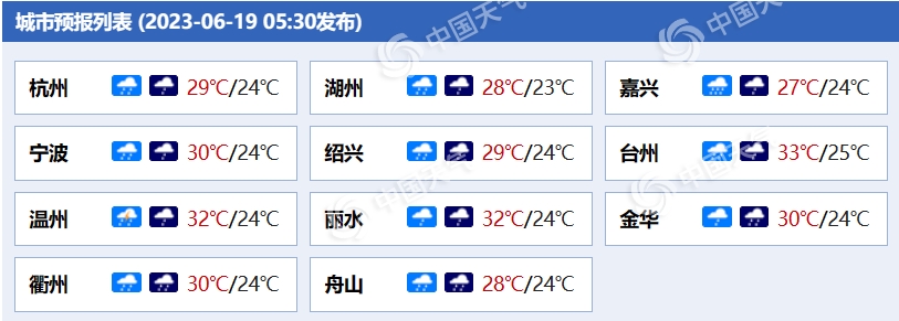根据浙江省气象台预报,今明两天,浙江各地雨势还将进一步增强,个别地区甚至可能有大暴雨现身。具体来看,今天,浙北和浙中西部地区多云到阴,上午起阴有阵雨或雷雨,部分中雨,局部暴雨;其它地区多云到阴,午后部分阴有阵雨或雷雨。最高气温: 浙北北部地区:27-29℃; 东南沿海地区:32-34℃; 其它地区:30-32℃。