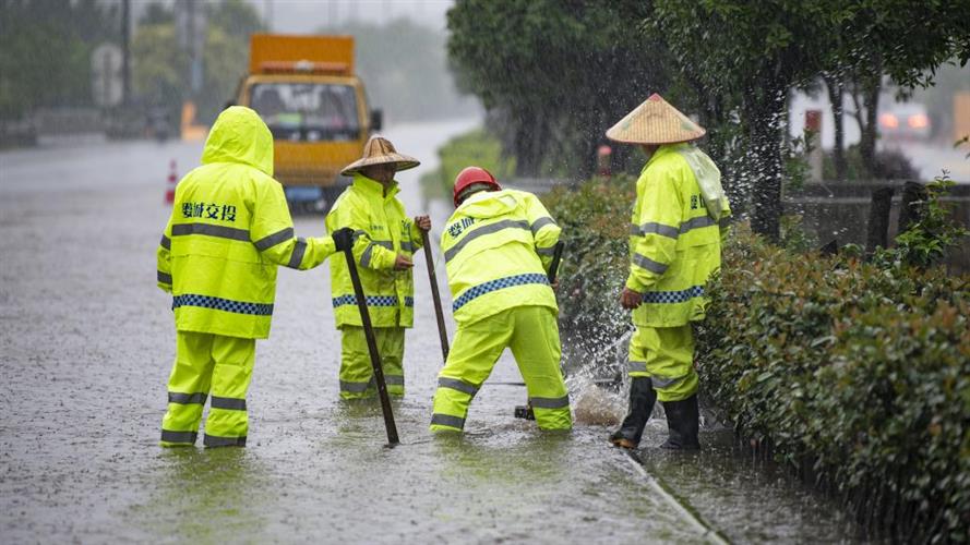 浙江金华婺城区虹戴公路,市政人员在疏通短时间强降雨造成的路面积水。视觉中国 图