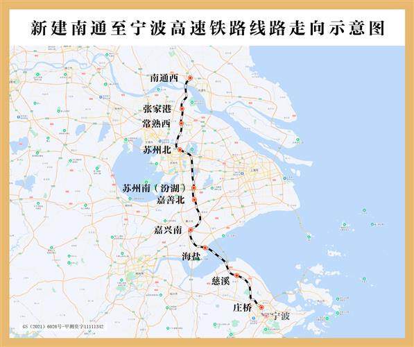 南通至宁波高铁线路自盐城至南通高铁南通西站起,向南经江苏省苏州市,浙江省嘉兴市、宁波市,引入宁波枢纽宁波站,新建线路长301公里,设计时速350公里,建设工期5年。全线设南通西、张家港、常熟西、苏州北、苏州南、嘉善北、嘉兴南、海盐、慈溪、庄桥10座车站,其中常熟西、苏州南、嘉善北、海盐、慈溪5座车站为新建车站,其他为既有车站。