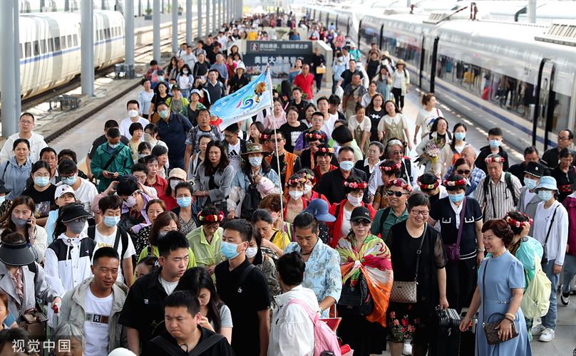 2023年6月21日,大理,端午小长假云南铁路客运提前迎来高峰。在国铁昆明局大理东站,节前以旅游团队出行和探亲出行为主的客流集中。 视觉中国 图
