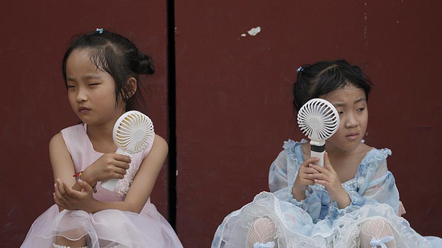 2023年6月25日,北京,孩子们在故宫附近用电风扇降温。人民视觉 图