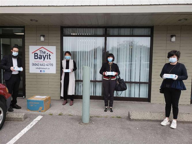 屈潔冰與加拿大和合文化研究會及温哥華中華文化促進會的義工把1000個口罩捐贈給列治文Bayit猶太社區組織。她們都戴上口罩和手套,並互相保持距離,把送贈的口罩擺放在中心門外,再由負責該組織的猶太教士Rabbi Levi Varnai搬入室內。