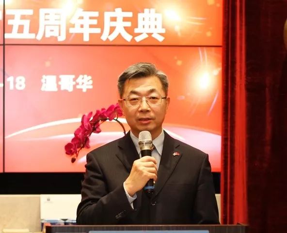 中国驻温哥华副总领事王承军在讲话中盛赞半岛公馆开业五年来为本地创造大量就业机会,为社区民众提供优质餐饮服务,更为社区公益事业做出贡献。他感谢半岛集团在海外努力弘扬中华餐饮文化,积极发展本地业务的同时,也不忘回馈祖籍国。他预祝半岛集团在未来取得更大的成绩。