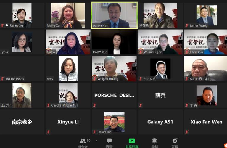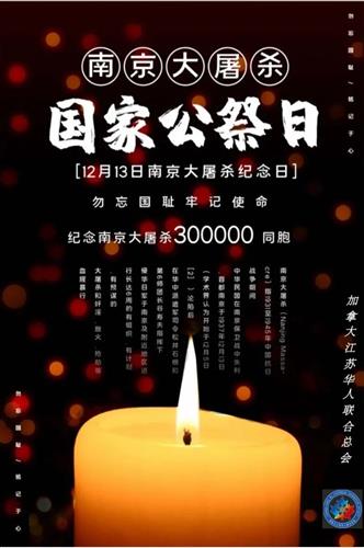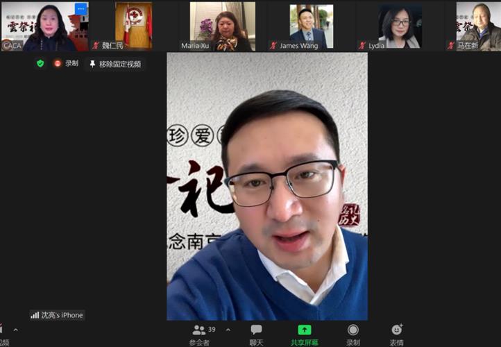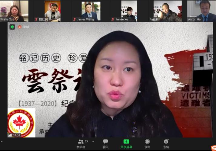 在温哥华当地时间12月13日,加拿大华人社团联席会、加拿大江苏华人联合总会举行了云端公祭,深切缅怀南京大屠杀无辜死难者。联席会执行主席魏仁民,联席会执行副主席薛晓梅,联席会执行副主席、江苏华人联合总会会长徐凌,南京市侨办二级巡视员臧雷,南京市侨办侨经处处长郑晓伟,BC省议员屈洁冰,本那比市议员王白进,江苏华人联合总会常务副会长沈亮,联席会顾问马在新,安徽同乡总会会长赵完全,江苏华联总会秘书长王静、副会长陈麒麟、秘书徐云波,学生代表钱闻宇等在公祭活动中发言,云端公祭由联席会监事长韩长福主持。加拿大华人社团联席会执行副主席曹卫红、薛培尧,执行委员范翔、李卉、梁矩、王乃华,副秘书长娄红、张惠鑫、黄薇燕,共同主席薛兵等和加拿大江苏华人联合总会部分代表也参加了公祭。