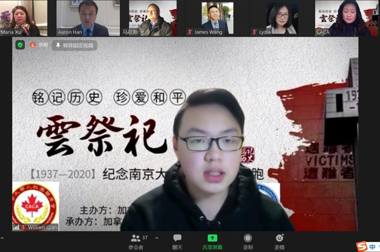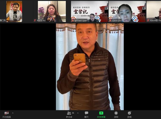 公祭开始,先播放了介绍南京大屠杀的电视短片,然后,云端与会者默哀一分钟。联席会执行主席魏仁民首先致辞,他说,我们在这里集会深切缅怀南京大屠杀无辜死难者,缅怀所有惨遭日本侵略者杀戮的死难同胞,缅怀为中国人民抗日战争胜利献出生命的革命先烈和民族英雄,宣示我们华人华侨铭记历史、不忘过去,珍爱和平、开创未来的庄严立场,表达我们坚定不移走和平发展道路的崇高愿望。华人华侨在海外更要加强团结,融入当地社会,与加拿大各族裔人民一起铭记历史,珍爱和平,共同发展。
