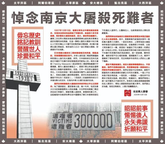 联席会执行副主席、江苏华联总会会长徐凌是土生土长的南京人,她说,历史不能被忘却,83年前的今天,在日本残暴罪行之下30万生灵惨遭涂炭,手无寸铁的百姓死于非命,这是日本侵略者对南京人民犯下的灭绝人性的滔天罪行。在南京大屠杀发生83年之际,我们更加希望和平,几十年来包括加拿大在内的无数国际友人前赴后继,在世界各地揭露二战亚洲浩劫日军暴行,推动有关人道教育、索偿与和解工作,并组织海外师生到中国实地了解日本侵华犯下的违反人道罪行。以警惕世人,也教育国民防止类似悲剧重演。