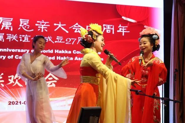 晚会上,许多老朋友因疫情所限近两年未见,大家畅叙友情。许多客家乡亲更是相见如一家,共叙乡音乡情,他们中多人一起参与了多届世客会,回忆以往世客大会,感慨良多。当晚晚会,在欢庆的锣鼓声中,和加中两国国歌声中拉开帷幕,感谢当晚晚会的艺术指导陈建中老师以及中中合唱团的支持。晚会中,客家童谣“月光光”,我是客家人,天下客家等节目,仿佛把在座客家乡亲带回到了故乡,带回到了童年。节目表演精彩纷呈。
