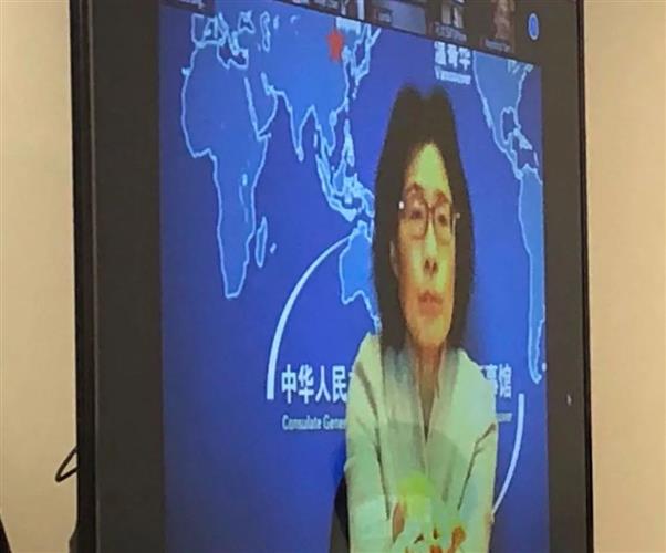 会议由许锦松执行会长主持,他首先邀请中国驻温哥华总领事佟晓玲通过视频发表讲话。
