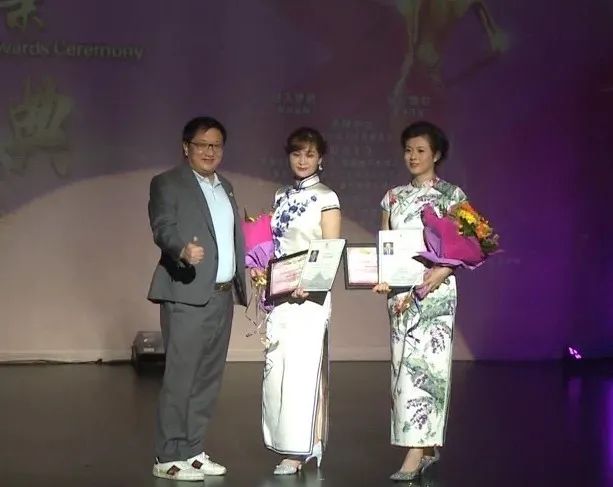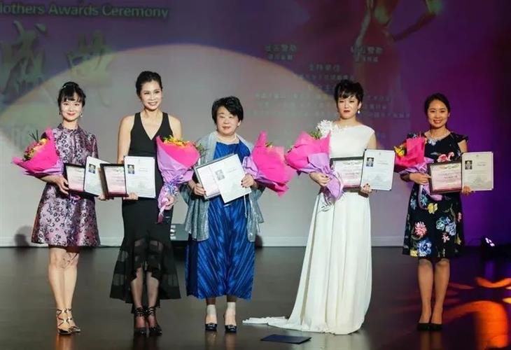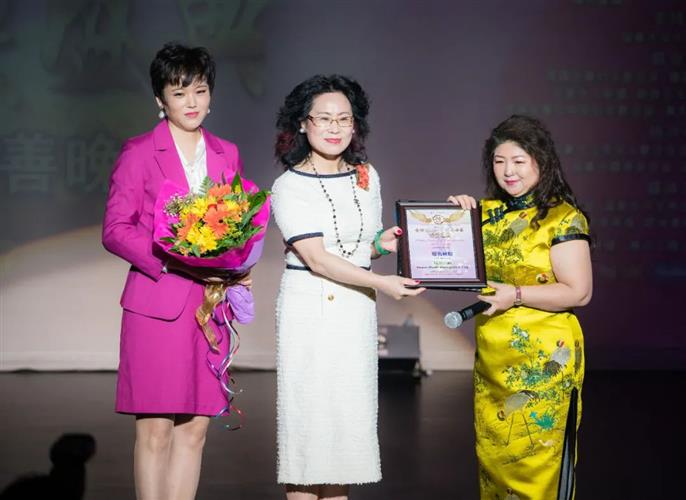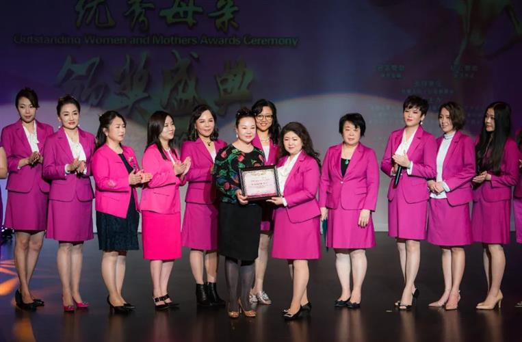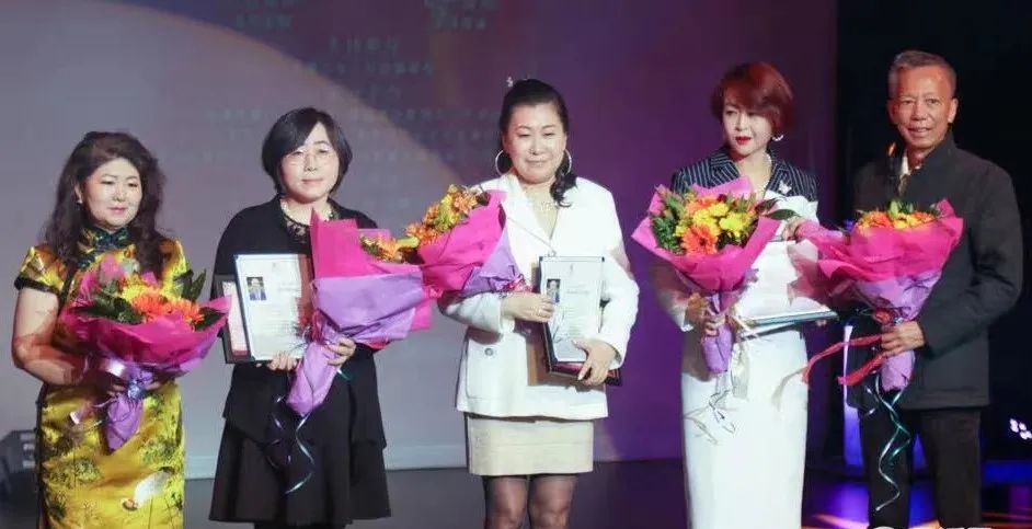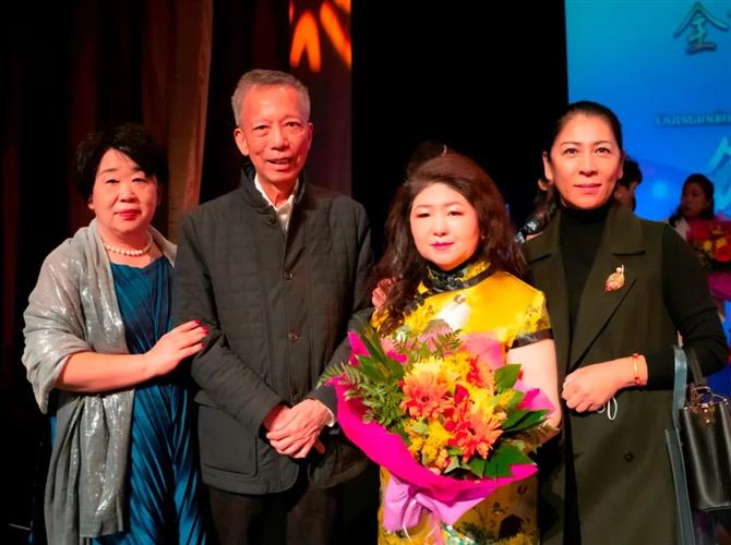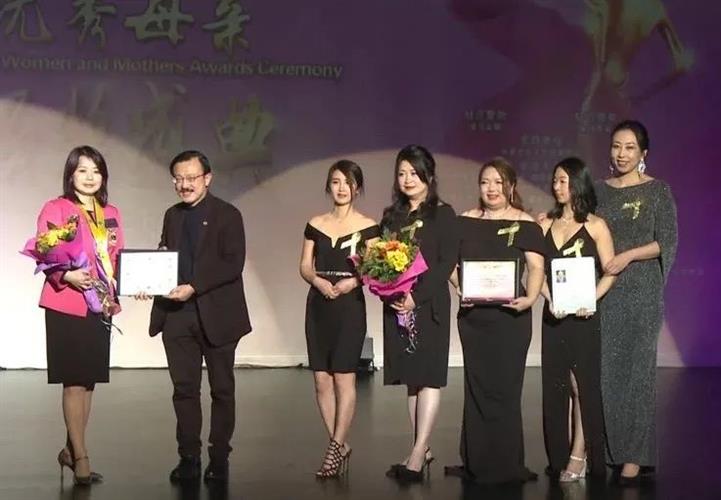 获奖者代表:美国世界华夏妇女联合会会长陆来冰(右2)、副会长李春红(左1)