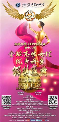 (本网讯)2021年11月26日晚,加拿大华人妇女联合会第十八届全球杰出女性、优秀母亲颁奖盛典暨慈善晚会,在大温哥华本拿比市迈克尔J福克斯剧院(Michael J. Fox Theatre)隆重举行。本次活动由来自五大洲的八大妇女团体联合主办,分别是加拿大华人妇女联合会、美国华夏妇女联合会、德国德中影视文化艺术协会、北美华人联盟、新西兰太平洋文化艺术发展协会、非洲安哥拉中华妇女联合会、澳大利亚无锡商会、中国东方丽媛苓。