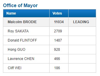 北温有两个市,其中 District of North Vancouver 的新市长为 Mike Little,领先优势明显。