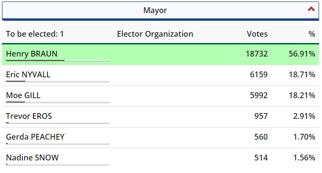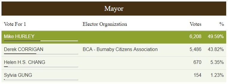 独立候选人、前任本拿比消防局代理助理局长赫利(Mike Hurley)一举击败担任本拿比市长16年的柯瑞根(Derek Corrigan),当选新一届市长。