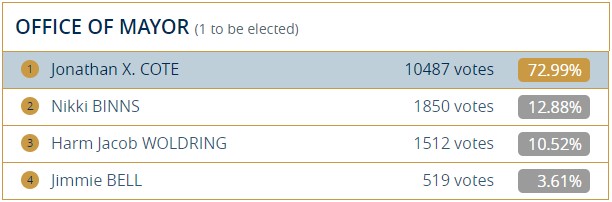 新西敏市市长由原市长Jonathan X. COTE连任,优势极其明显。