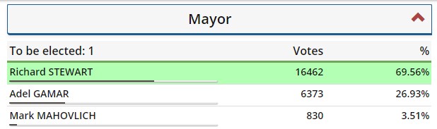 高贵林市前市长Richard STEWART也获得连任,领先优势也很明显。
