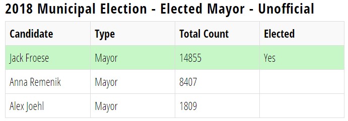 Langley Township的市长Jack Froese也获得连任,领先优势明显。