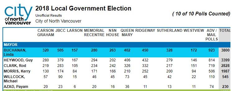 而 City of North Vancouver 的北温市长候选人、市议员布坎南(Linda Buchanan)成功以29.4%的得票率,击败对手,当选新一任市长。