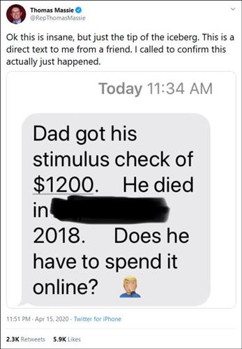 肯塔基州的共和党众议员托马斯·马西(Thomas Massie)15日在推特上发了一张朋友发给他的短信截图,里面写道:“我爸拿到了他的1200美元刺激支票。他2018年过世了。所以,他必须要线上花掉这笔钱么?”