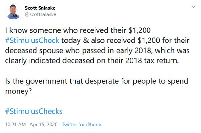 金融顾问斯科特·萨拉斯克(Scott Salaske)15日发推文写道:“我知道今天有些人既收到了自己的1200美元刺激纸支票,也收到了他们早在2018年就亡故的配偶的1200美元,而他们2018年的纳税申报单已经清楚表明了配偶亡故。政府就这么急着让人们去花钱吗?”