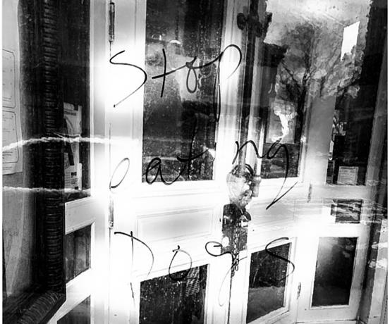 想,还是鼓起勇气点开了消息附件里的照片。照片显示,在他心爱的餐厅正门窗户上写着:“别吃了,狗们!”