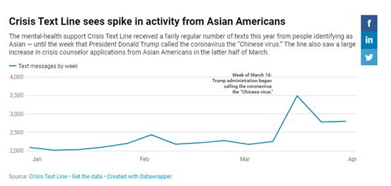 第一周到3月的最后一周之间,来自亚洲人的短信增加了39%。在此期间,求助量最多的发生在争议病毒起源的那周。![]()