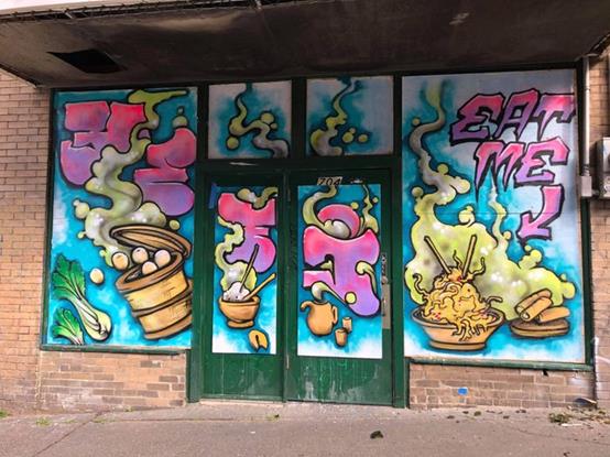 在Chan的中餐厅因故意破坏而不得不钉上木板后,当地艺术家用明亮美丽的壁画覆盖了木头