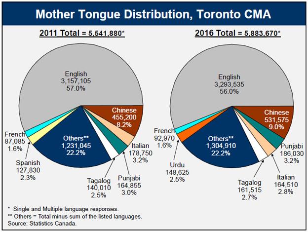 而华人呢?2016年华裔人口177万,占比5.1%(注11),比意大利族要多。其中大多伦多地区人口720万,华裔70万,接近10%的比例。