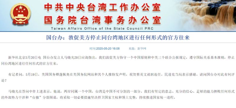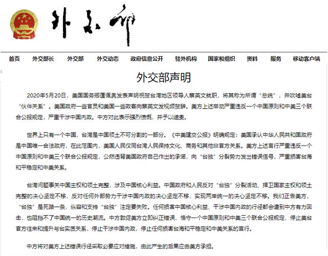 5月20日,台湾地区领导人蔡英文就职连任。美国国务卿蓬佩奥跳了出来,在美国务院网站和蓬个人推特发声明,祝贺蔡,将其称为所谓“总统”,并吹嘘美台“伙伴关系”。
