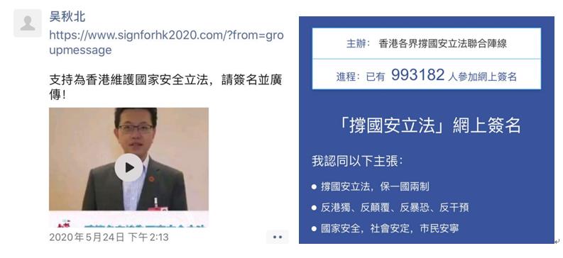 5月24日,谭主在微信里看到,香港工联会会长吴秋北在朋友圈中呼吁,香港各界要行动起来“撑国安立法”。目前为止,已有超过99万人参与网上签名,此外还有约73万人参与现场签名。