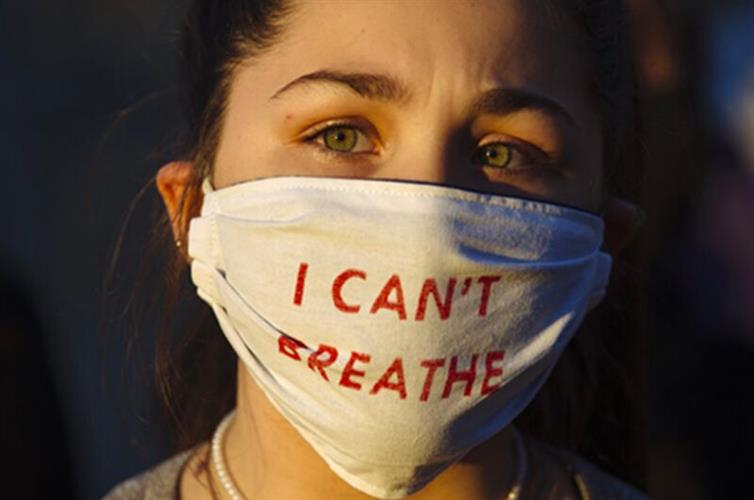 2020年5月30日,美国明尼苏达阿波利斯市,一名抗议者戴着写有“我不能呼吸”的口罩。