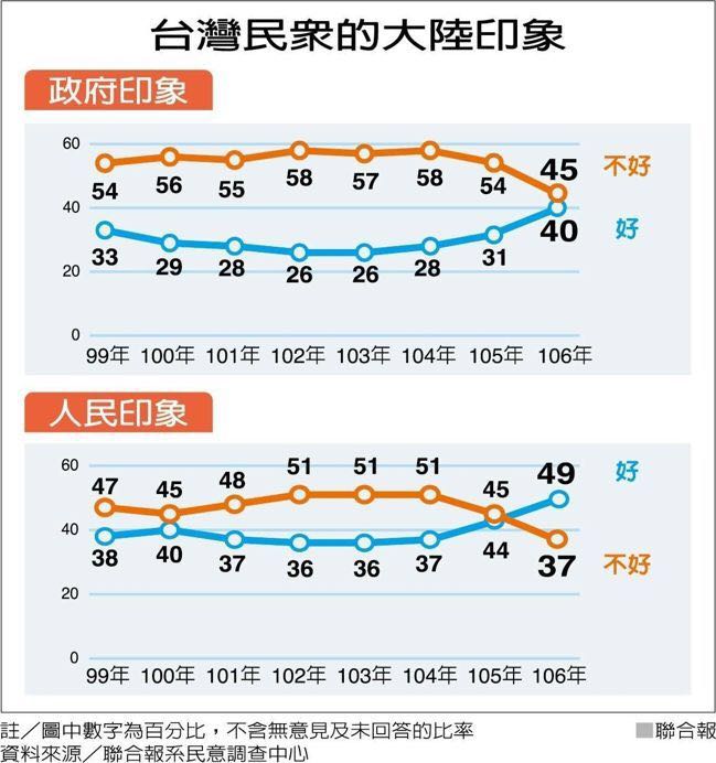 据中評社北京11月24日报道,日前,島內平面媒體發布“兩岸關係年度大調查”系列民調數據顯示,受訪台灣民眾對大陸政府“印象好”的比例達到40%,對大陸人民“印象好”的比例達到49%,均創下近年來新高。值得注意的是,對大陸人民“印象好”的比例首次超過“印象不好”。此外,受訪者赴大陸工作、創業、送子女去大陸念書的意願,較往年都有所提升。
